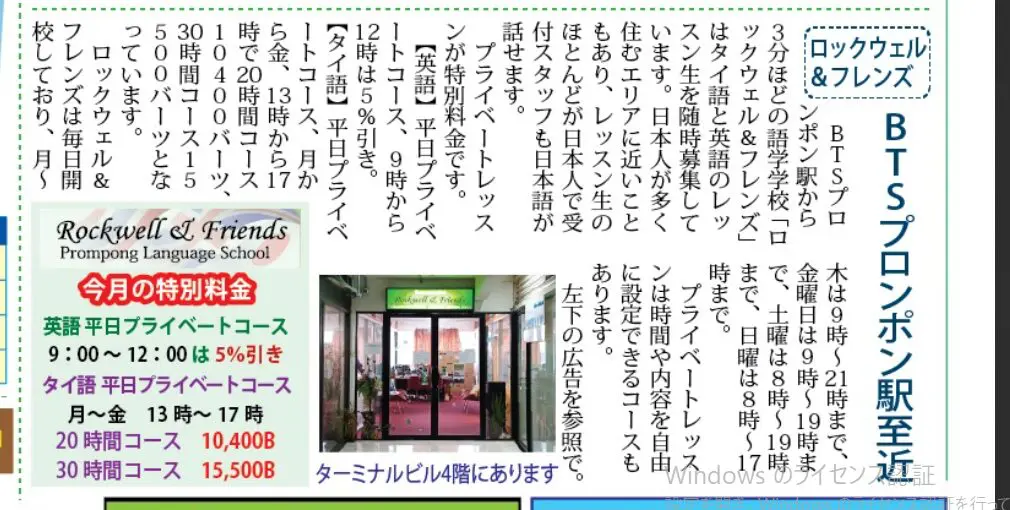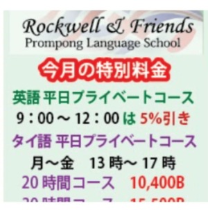 BTSプロンポン駅近くの「ロックウェル&フレンズ」は、タイ語と英語のプライベートレッスンを提供する語学学校です。特に日本人が多く通うエリアで、日本語対応のスタッフがサポート。今月の特別料金や柔軟なカスタマイズコースもあり、学習時間や内容を自由に設定できます。年中無休で、アクセス便利なターミナルビル4階に位置しています。