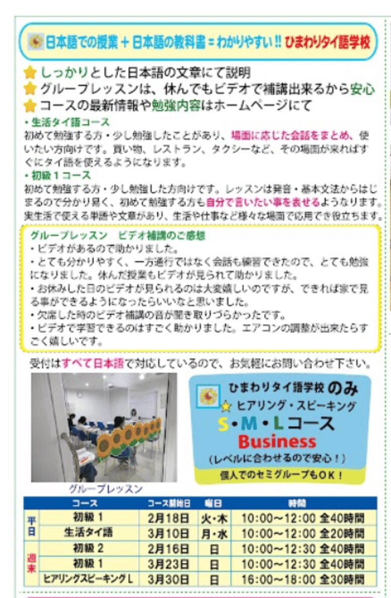 詳細や最新の情報については、ひまわりタイ語学校の公式サイトをご覧ください¹。