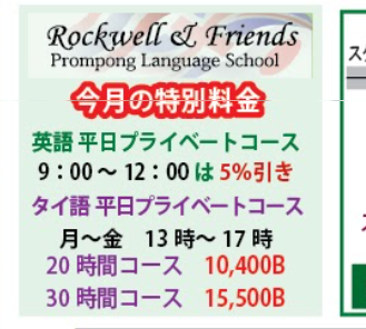 BTSプロンポン駅徒歩3分の語学学校「ロックウェル&フレンズ」では、タイ語・英語のプライベートレッスンを提供。平日9:00~12:00の英語レッスンは5%割引、13:00~17:00のタイ語レッスンは20時間10,400B、30時間15,500Bとお得。自由に時間や内容を設定でき、日本語対応のスタッフもいるので安心。スクムビット通り・エムクオーティエ近くのターミナルビル4階で開校中。土日も開講し、通いやすさ抜群!