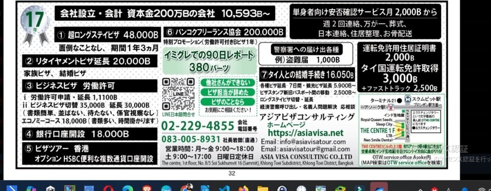 「アジアビザコンサルティング」は、タイでのビザ取得・切り替え、会社設立をサポートする専門企業。国内でのビザ変更、銀行口座開設、労働許可証取得、運転免許取得などを支援。BTSアソーク駅近くのTHE CENTREビルに移転し、アクセスも便利に。15年以上の実績があり、他社で断られた案件も対応可能。日本語での相談ができ、電話・メール・LINEで問い合わせ可能。ビザやビジネスに関する悩みは気軽に相談を。