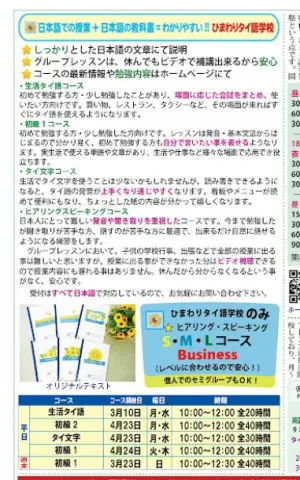 「ひまわりタイ語学校」では、日本語での授業&教科書を使用し、初心者でも安心してタイ語を学べます。生活タイ語・初級・タイ文字・ヒアリング&スピーキングなど多彩なコースを用意。急な欠席時もビデオ補講が可能で、受付も日本語対応なので安心。グループレッスンからビジネス向けまでレベル別に学べ、実生活で役立つ会話力が身につきます。最新のコース情報は公式サイトで確認可能。タイ語を楽しく学びたい方におすすめの学校です!
