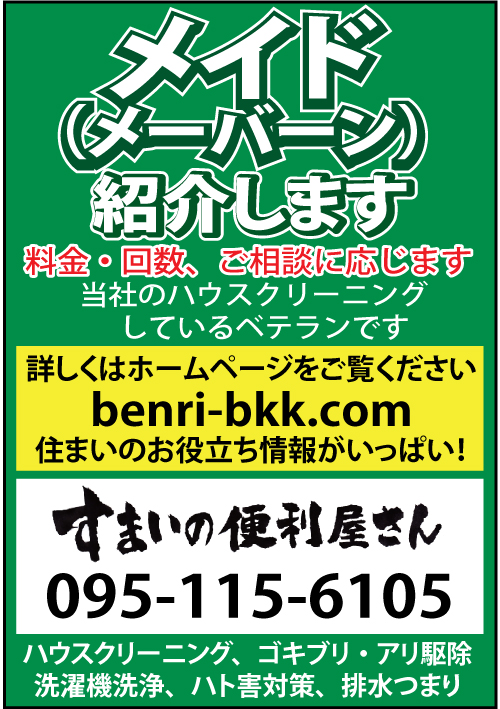 すまいの便利屋さんは、バンコクで住まいや店舗のお困りごとを解決するサービスを提供している会社です¹。エアコンクリーニング、洗濯機クリーニング、ゴキブリ駆除、ハウスクリーニング、リフォーム、引越し、小荷物運搬など様々なサービスがあります¹。