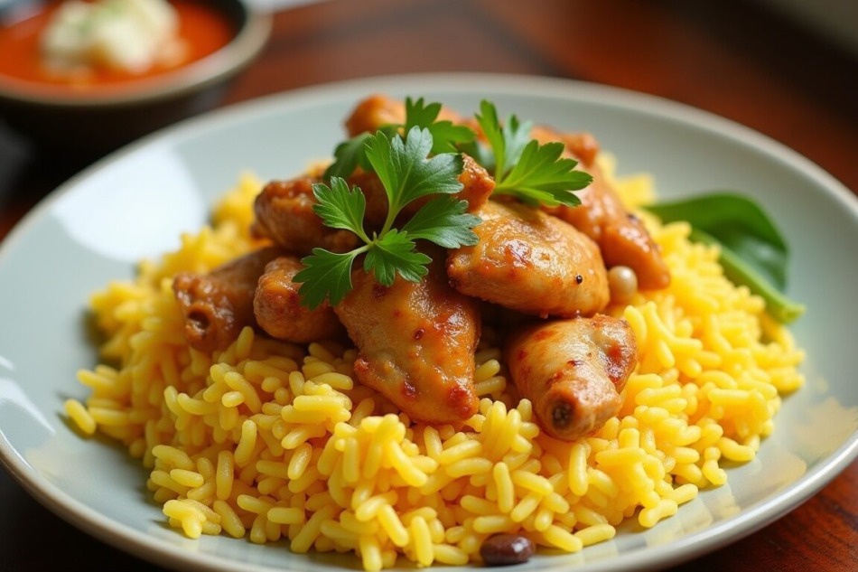 注文すると、ピカピカ黄色のご飯の中から、ホロホロの鶏が登場!