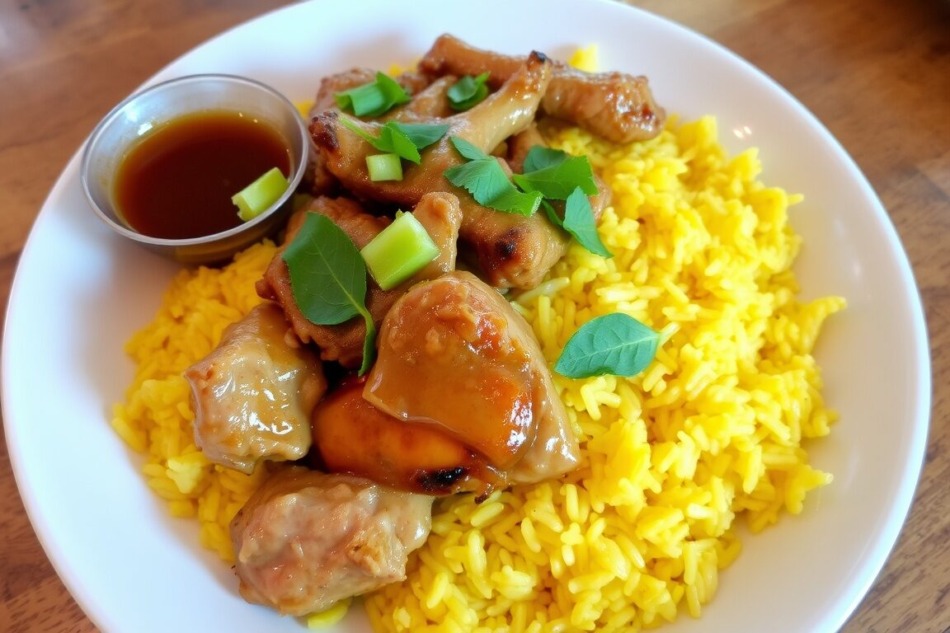カオモッカイは、ターメリックやシナモンなどスパイスたっぷりの炊き込みご飯に、やわらか〜く煮込まれた鶏もも肉がドーンと乗った豪快な一品。