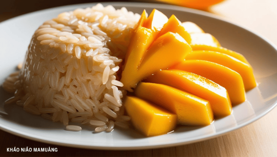 カオニャオ・マモワンは、ココナッツミルクで甘く味付けしたもち米に、完熟した香り高いマンゴーを添えて、さらにココナッツソースをたっぷりかけて食べるスイーツ。甘い・しょっぱい・クリーミー・フルーティーが全部1プレートに詰まってる!そしてこの不思議な組み合わせが、なぜか完璧にマッチするんです。天才か。
