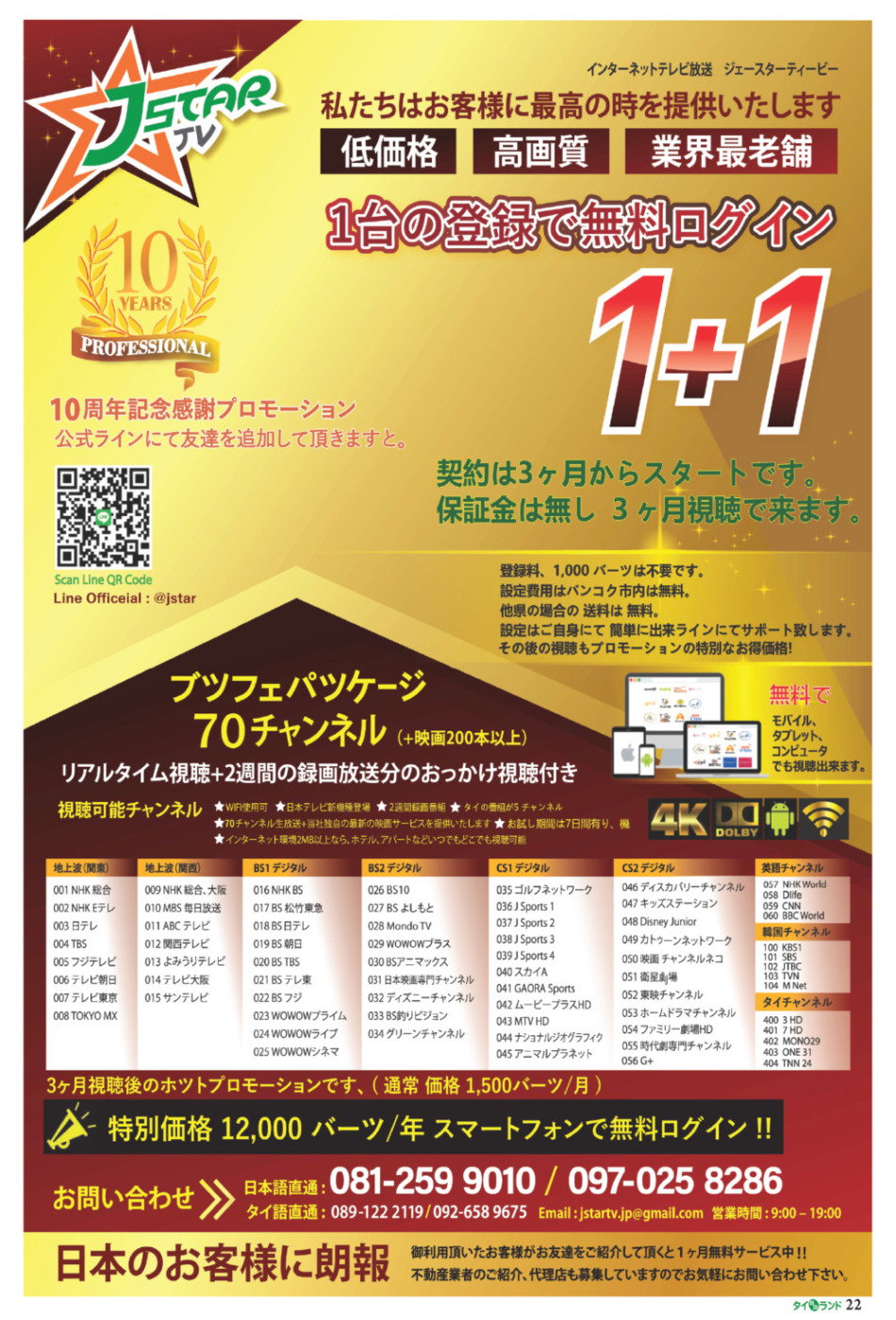 特別価格: 12,000バーツ / 年(年間契約で月あたり1,000バーツ相当)。