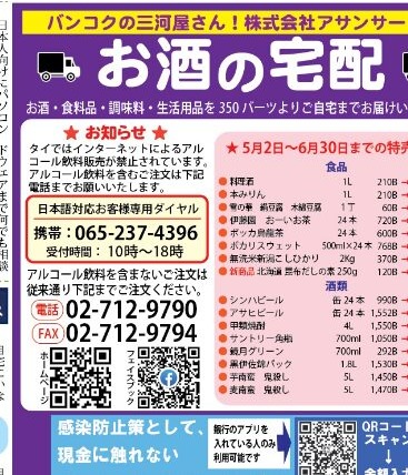 注文は日本語対応の専用ダイヤルで可能なので、タイ語に不安がある方でも安心。また、ネットでのアルコール販売が禁止されているため、お酒類の注文は広告内の電話番号からどうぞ。