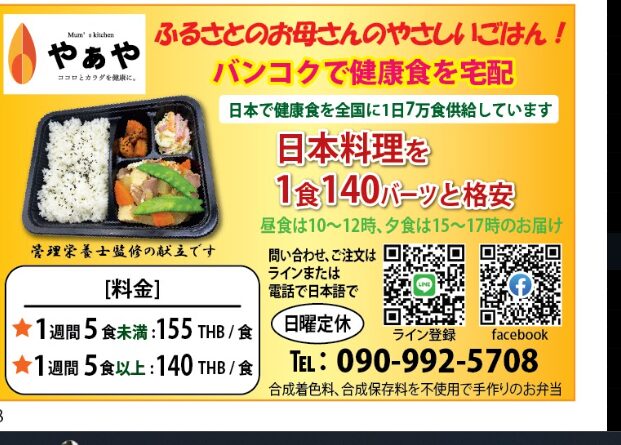 北陸発の「やぁや」は、バンコクで健康的な日本食弁当をデリバリー中。1食140バーツで、栄養バランスの取れた昼・夜メニューを月〜土に提供。カロリーや栄養素も明記されており、ダイエットやシニアにも最適。配達エリアも拡大中。