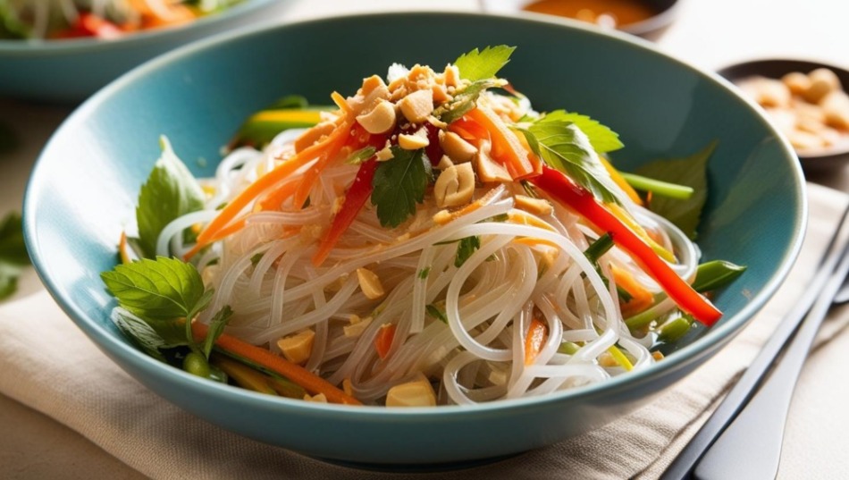 クンオップウンセンは、鉄鍋の中でエビと春雨をたっぷりの香味野菜と一緒に蒸し上げた一品。フタを開けた瞬間、立ちのぼる湯気とともに香るのは、生姜、にんにく、胡椒、セロリ、そしてちょっぴりの中華醤油の香り。まるでタイと中華の料理が屋台の裏で手を組んだような、そんな味わい。