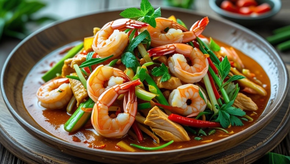パッルアムミットは、豚肉や鶏肉、シーフード、野菜など何でもありの“ごちゃまぜ炒め”。まるで「冷蔵庫の余り物オールスターズ」みたいな料理だけど、これが不思議とうまい!