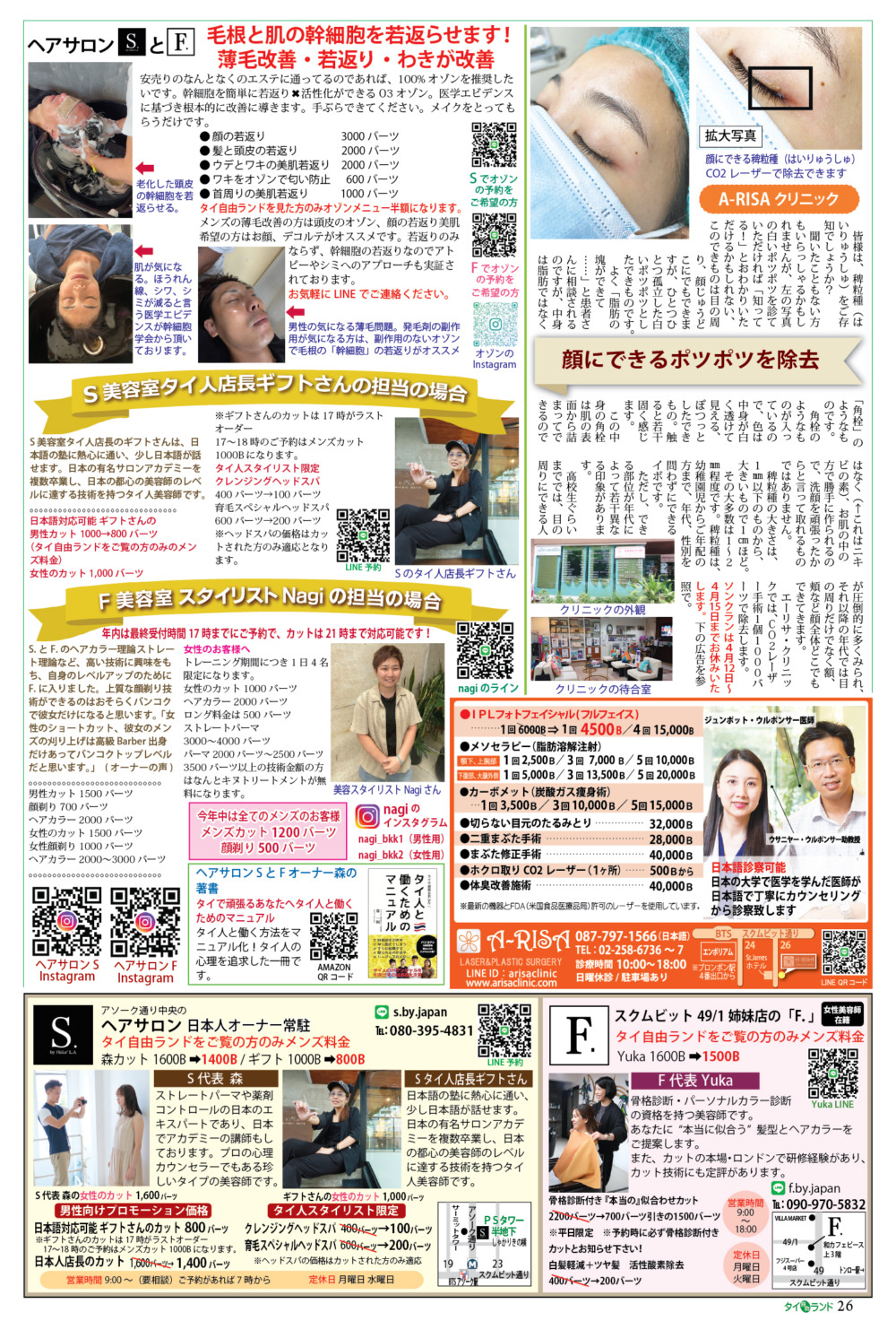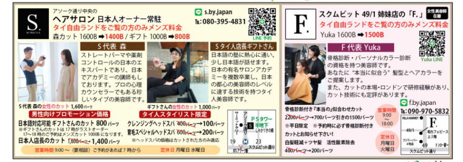 **「タイ自由ランドを見た」**と伝えると、広告記載のプロモーション価格(メンズカット割引やヘッドスパ割引など)が適用されます。