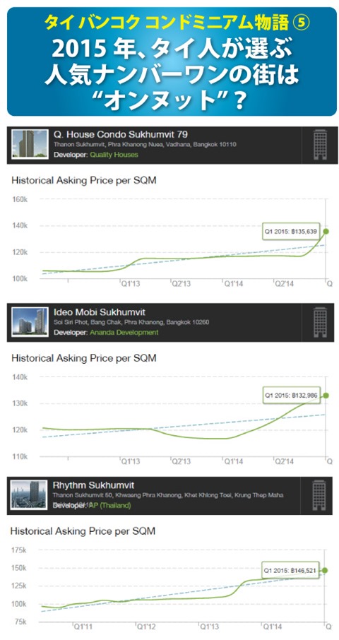 一方で、オンヌットはまだ実需が中心のマーケットです。しかし、そうは言っても、オンヌット駅前の築浅コンドミニアムで、平米10万バーツなどというのはもうありません。添付したQハウス、アイディオ、リズムのリセール価格推移のグラフを見ても、アソークやトンローに比べたら出遅れているものの、最近、急ピッチで値上りしてきています。今はもう平米13万から14万バーツ出さないと買えないという感じで、あと半年もするとオンヌットの相場も平米15万から16万バーツに届いてしまうような勢いです。