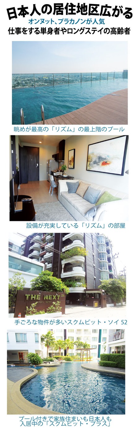 日本人向けにバンコクの住まいや店舗を紹介する不動産会社の日本人担当者によると、このエリアは特に単身の駐在員が多く住んでおり、また、ロングステイの人も以前に比べて増えてきているといいます。