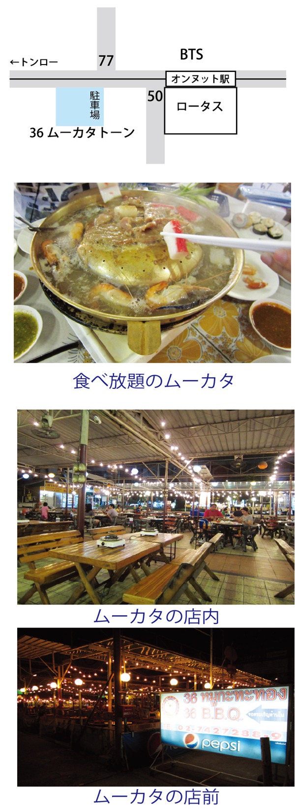 BTSのオンヌット駅をおりて、ロータス前を通り、3分ほど歩くと、「36・ムーカタ・トーン」という食べ放題の店があります。車で通る時によく見るのですが、いつも、あまり人が入っていないように見えます。ところで、この「36」というのは以前、スクムビットのソイ36の角にみすぼらしい食べ放題の店があったのですが、それが移転したのでしょうか。今は立派なノーブルのコンドミニアムが建てられています。