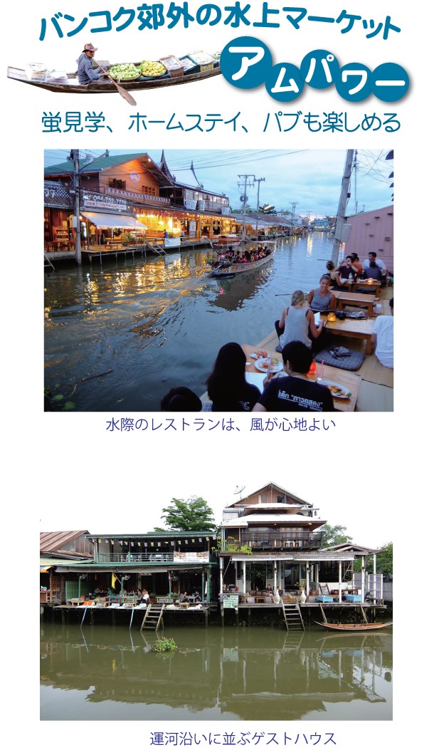 夜の雰囲気を堪能し、深夜バンコクに帰ることも可能ですが、今回は、川沿いのゲストハウスで一泊しました。その価値は十分ありました。宿泊してこそ感じる魅力がアムパワーにはあります。水上マーケット周辺に宿泊施設はたくさんありますが、夜の雰囲気を満喫するには運河沿いの宿がおすすめです。ホームステイができる家も運河沿いに点在しています。