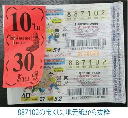 今回、3000万バーツを当てたのはピヤさん、41歳。ラヨーン県でくだもの園を営んでおり、抽選日は10月1日だったが、その2日ほど前に娘が、モーターサイが家の前に停まった夢を見たので、ピヤさんは自分の家にあるバイクの番号502の宝くじを買いに行ったがなかったので、末の3ケタで102を選んだ。5枚つづりで買ったが抽選日に887102が当たり、妻とともに急いで警察署に出向き、証拠の調書を取った。