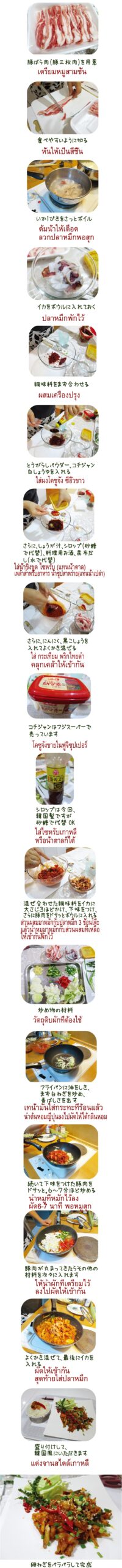 ①まず、とうがらしのパウダーを大さじ2。タイで売っている一味とうがらしですね。そこに 市販のコチジャンを大さじ2。さらにタイの白しょうゆ 大さじ1と1/2、もし料理用のお酒があれば 大さじ1、シロップ 大さじ2、砂糖 大さじ1/2、しょうが汁 大さじ1、昆布だし 大さじ3、にんにく 大さじ1と1/2、黒こしょう少々を入れて混ぜ合わせます。1人身の男性で「そんなたくさんの調味料はない!」という人なら、コチジャン 大さじ2、タイの白しょうゆ 大さじ1と1/2、砂糖大さじ1、すりおろししょうが 大さじ1、にんにく 大さじ1と1/2、水 大さじ3でOK!