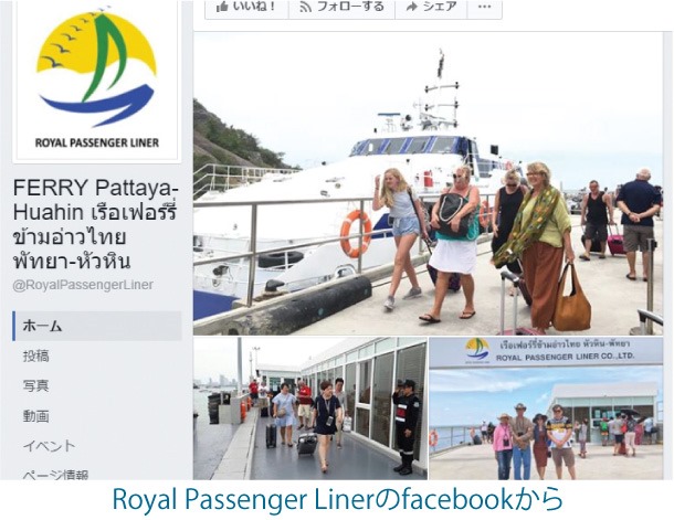 ロイヤルパッセンジャーライナー社によるパタヤ~ホアヒン間のフェリーのクルーズで、毎日、午前10時にパタヤを出発、12時にホアヒン着、ホアヒン出発は12時半で、パタヤ着は午後2時半。片道1人1250バーツでファーストクラスは1550バーツ。問い合わせは同社038-488-999