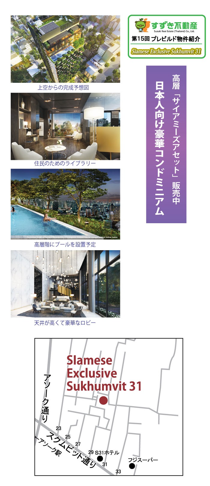 Siamese Asset(サイアミーズアセット)も初心に帰ってか、8年前にコンドミニアム1号のプロジェクトが開始された同じソイ31で、高層の物件として、隣のサンシリと張り合う様に建築が始まっています。この物件で新たに取り入れられた要素として、1ベッドからペントハウスまで、プライベートリフトを取り入れた点がまず挙げられます。6台のエレベーターが2ヵ所出口を設け、同じ階としても振り分けられています。エレベーターから出た所は、既にプライベートエリアとなり、部外者の侵入はございません。よって、そこのスペースにどのタイプも、洗濯機が収納出来る様になっています。他の要素として、駐車場が地下3階までと、集中管理型の駐車構成で、それぞれほぼ半数の駐車スペースを補っています。お部屋のレイアウトは、サイアミーズが持ち味とする、横長のレイアウトはベランダ側にリビングを設け、中央に寝室をガラス戸で囲む、好評レイアウトは1ベッドで健在です。2ベッドは70平米でバスルームを1ヵ所だけにする事で、他のスペースを有効に活用でき正解でしょう。ここ最近得意として売りにしている、メゾネットタイプも少ないですが、用意されています。