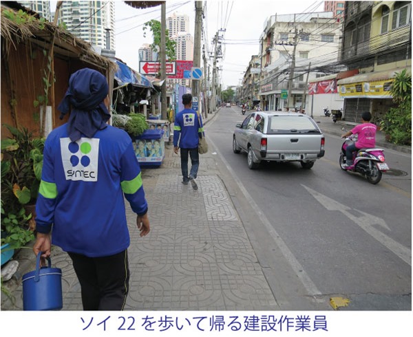 夕方、現場での仕事が終わり、歩いて帰る労働者を見ていると、ソイ22をずっと歩いていきます。そうして、たどりついたのは中ほどにある大きな駐車場がある一角。シーロムサウナのあるところです。ここでプレハブ住まいをしているようです。