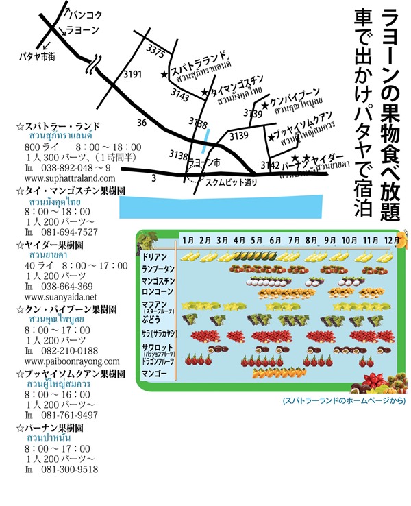 毎日開いており、朝8時から夕方6時まで、1人当たり300バーツほどでとれたてのくだものが食べ放題です。タイ観光庁でもタイ人向けに積極的に宣伝しており、車で出かけ、帰りにパタヤで1~2泊するというパターンも多いといいます。