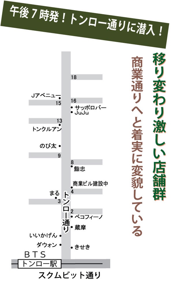 ソイ18から先は それほど賑やかではなく、トンロー通り全体を見ても、活気があるのはトンローソイ8、9~17、18までに集中しているようだ。そして今、徐々にそのほかの場所も、小さな開発が進められ商業ビルへと様変わりしており、トンロー通りもじわじわと通り全体がレストランやバーで活気ある通りに変ぼうしつつあるようだ。 (M)