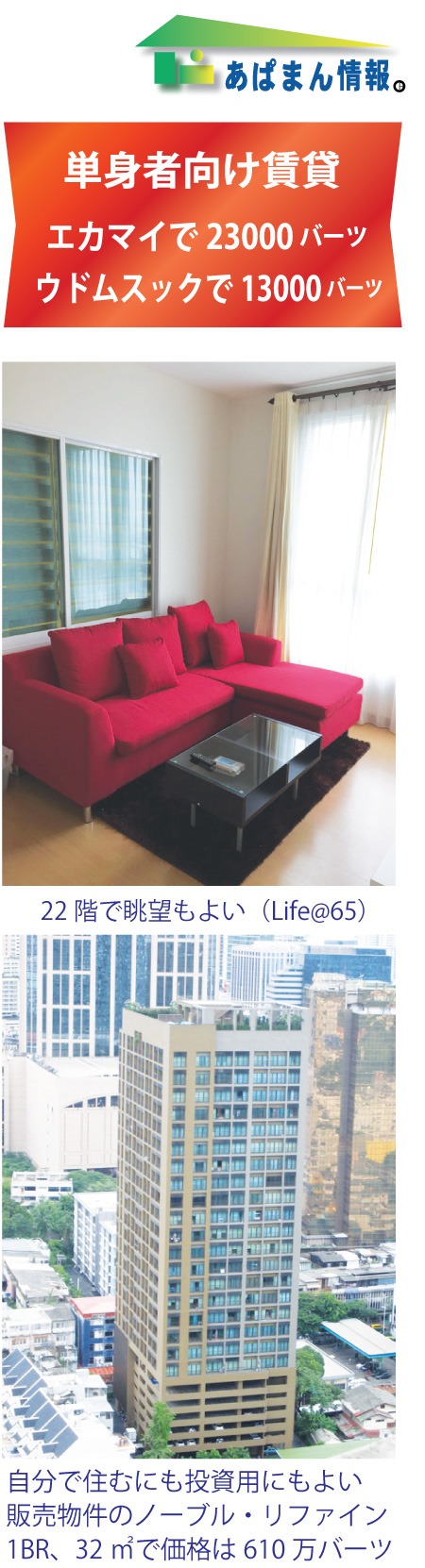単身者向け賃貸でエカマイで23000バーツ、ウドムスックで13000バーツ