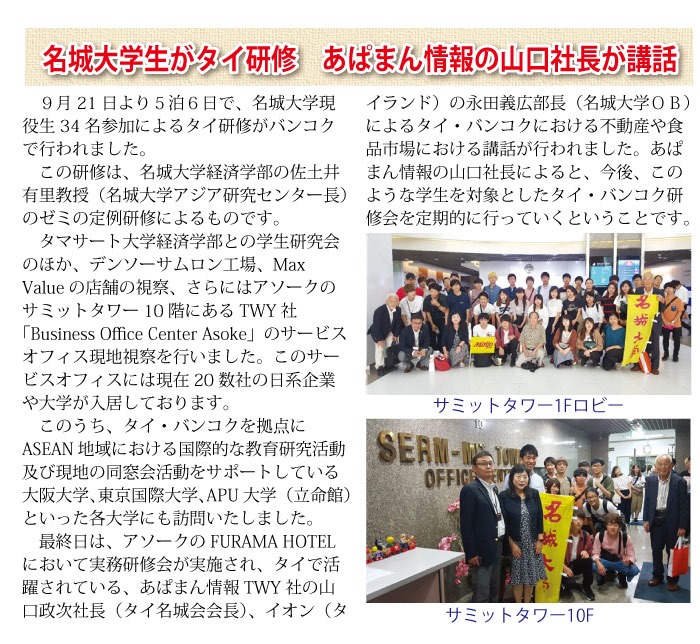 2020年2月7日名城大学の外国語学部のアーナンダ・クマーラ学部長は、タイ・バンコクのTWYオフィスセンターを訪問した際、タイ名城会会長である山口政次氏に、名城大学外国語学部の新入生120名を対象し ...