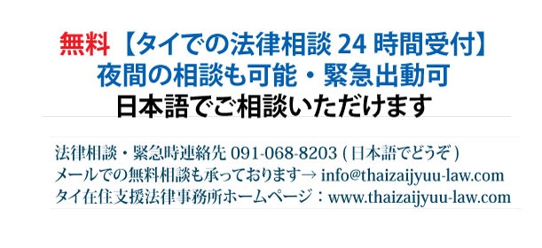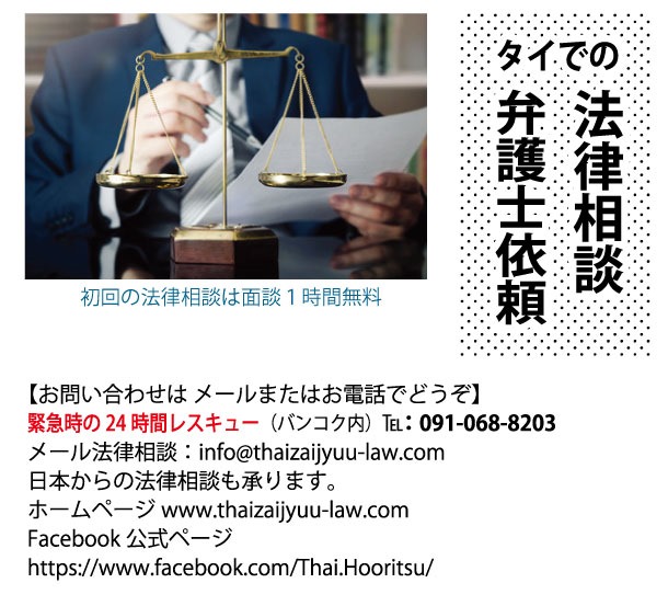 タイ在住支援法律事務所は、規模・業種・個人を問わず、タイの日常生活で引き起こる様々な法律的諸問題についての法律相談が無料で受けられます。当事務所は、幅広い依頼者の方々がかかえる法律問題解決のニーズに対応し、問題の解決に ...