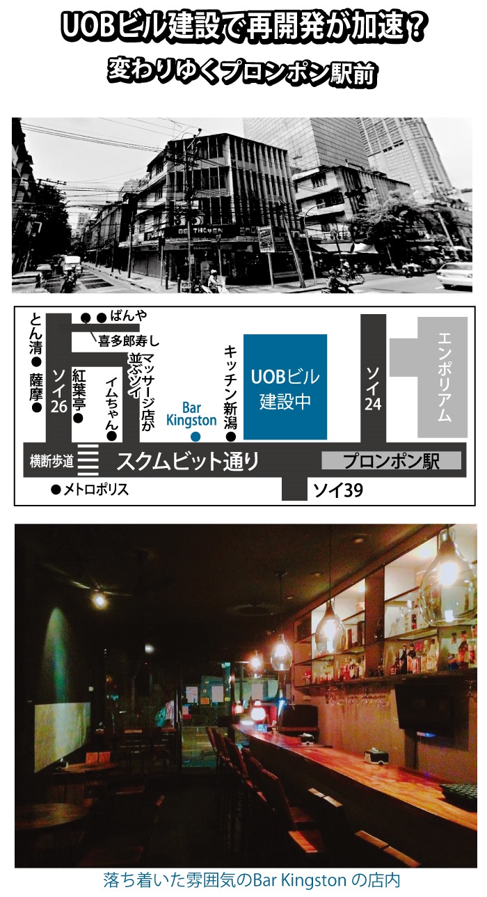 再開発の波にさらされているBTSプロンポン駅からソイ26に向かうスクムビット通りだが、そんななかで、夕方からひっそり明かりがともされるのが「Bar Kingston」。